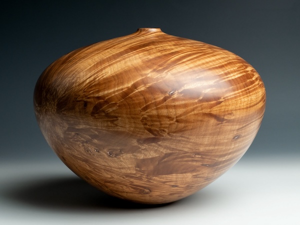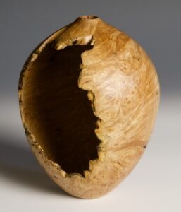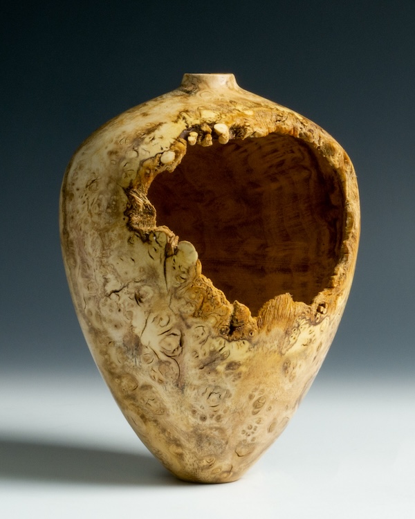 We often see hollow forms with natural voids in their walls. I have found that by leaving the natural surface of the log in the blank and manipulating the blank on the lathe, we can create much larger, natural edge voids using any piece of wood. This concept is similar to creating a natural edge bowl. Though, the resulting natural edge opening is in the side of the vessel. The thought of hollowing with such a large void may seem intimidating, but it is actually excellent hollowing practice because you can see the cutter working inside the piece as it turns on the lathe, and these are a lot of fun to make!